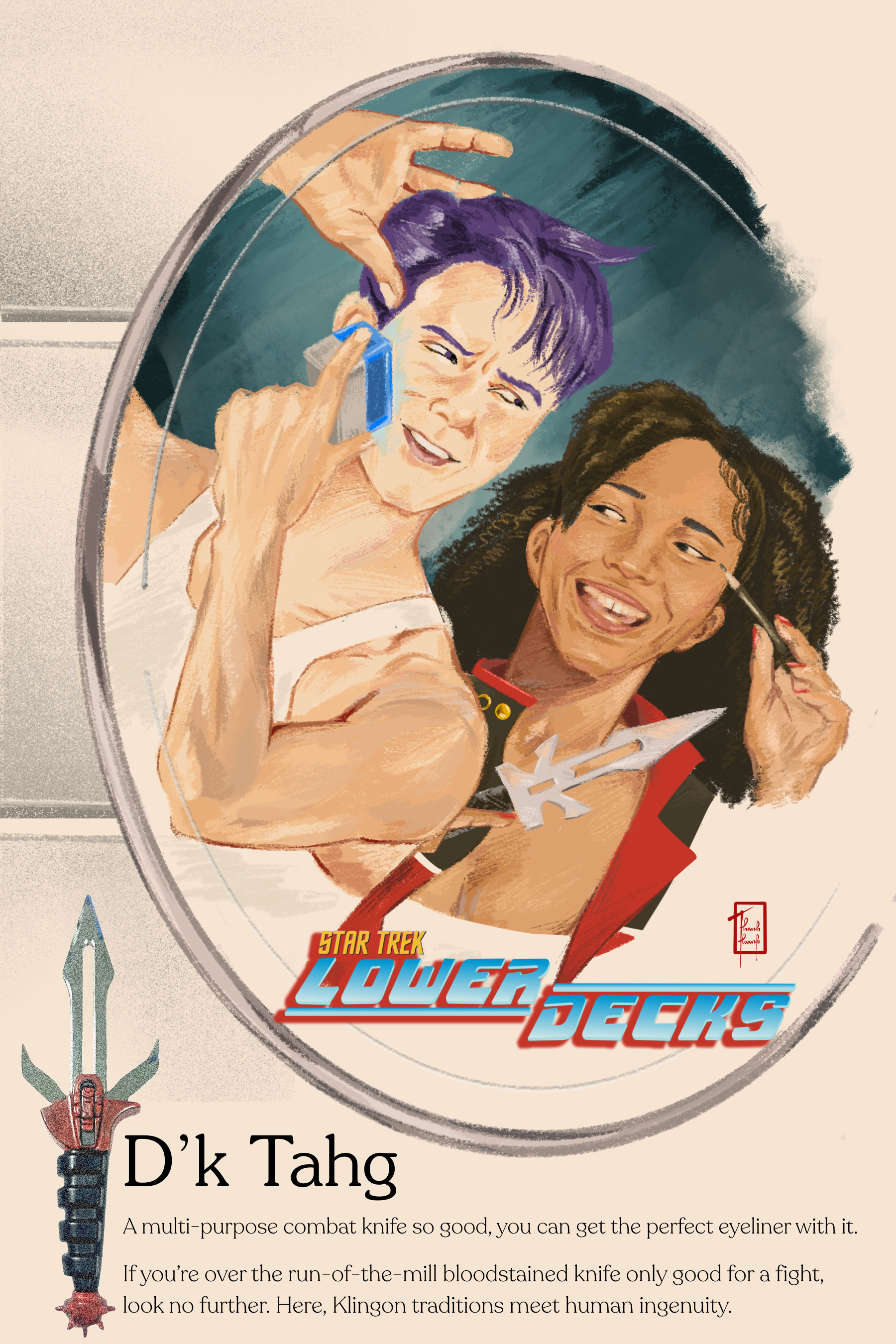 Benefiting the Palestinian Children’s Relief Fund, the artists within the Lower Decks fandom came together to publish a fanzine. I paid tribute to a vintage-styled advertisement and gave it a sci-fi twist to match the characters' personalities. The fans of the series love the banter and push-and-pull between these two characters. So my main focus was to capture that playful dynamic in a snapshot of a domestic moment like getting ready in the morning together to contrast the bigger than life scenarios from the show.